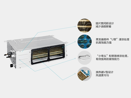 厨享内机采用金色防腐翅片换热器,抗腐蚀能力强,翅片采用宽间距设计,可减少油烟附着:换热器采用V型设计,使风速更均匀。