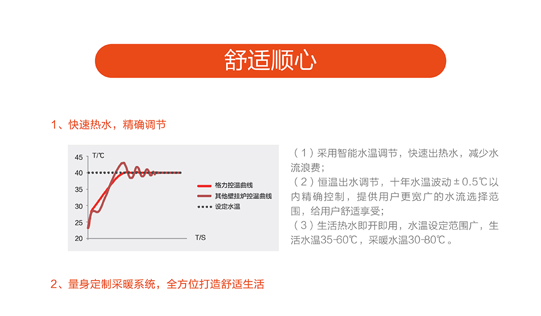 全预混燃烧结合双宽域功率调节,节能恒温,温差在±0.5℃之间,保证热水四季恒温快速出热水,减少水流浪费,生活水温度35-60℃,采暖水温30-80℃